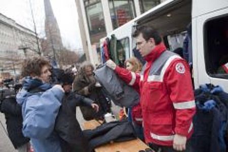 Rotkreuz-Helfer vom Obdachlosenbus geben auch heiße Getränke und Essen in der Hamburger Innenstadt aus. Rotes Kreuz bittet um Spenden von warmer Kleidung.